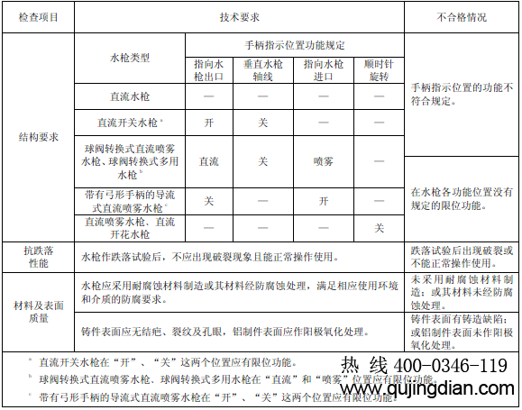 6.11.1.2 檢查方法 6.11.1.2.1 目測檢查消防水槍各操縱機構動作及限位的情況、指示標記、材料及表面質量。直流噴霧水槍﹑直流開花水槍,其調節噴霧角和開花角的旋轉開關的旋轉方向可從水槍的進水口觀察。 6.11.1.2.2 水槍跌落試驗:水槍以噴嘴垂直朝上﹑噴嘴垂直朝下(旋轉開關處于關閉位置)以及水槍軸線處于水平(若有開關時,開關處于水槍水平軸線之下并處于關閉位置)三個位置,從離地2.0m±0.02m 高處(從水槍的*低點算起)自由落到混凝土地面上。水槍于每個位置跌落兩次后進行檢查。   6.11.1.3 檢測器具      鋼卷尺:*小分辨率為1mm,量程不小于2m。 6.11.2 消防炮  6.11.2.1 檢查項目      檢查項目、技術要求和不合格情況見表60。